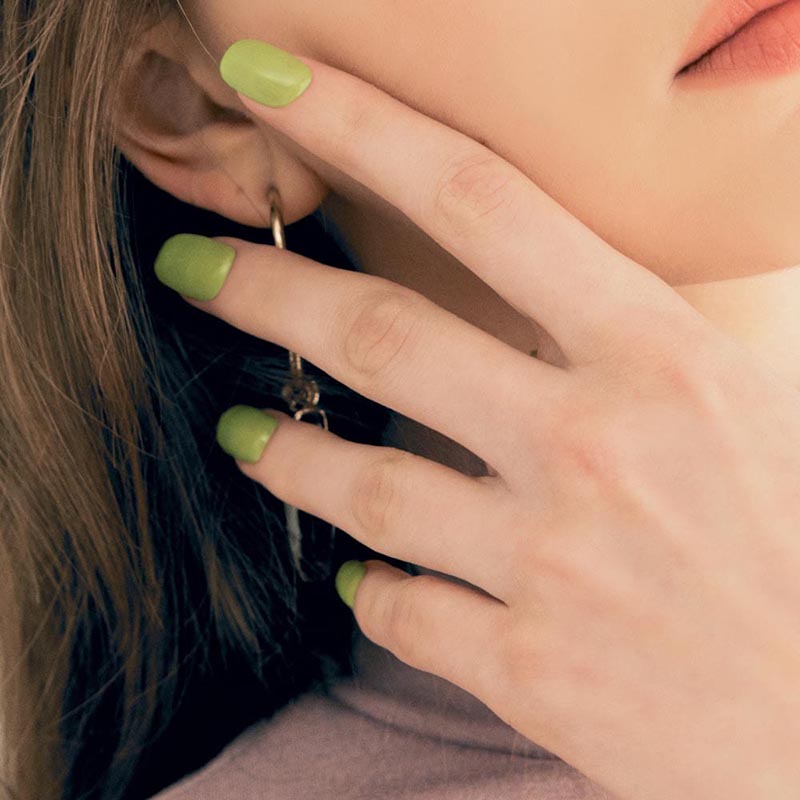 Forkæl dig selv med luksus med denne glatte manicure, lavet med Ohoras signatur half-syrup gel. Indeholder et ensfarvet design med gul-grøn gel.