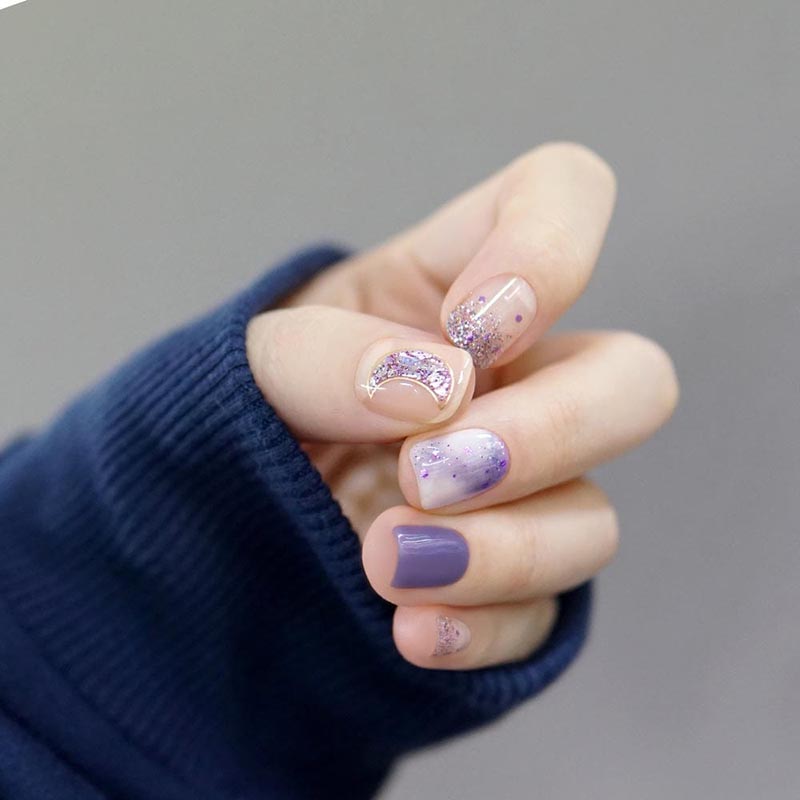Omfavn en fortryllende skønhed med denne fascinerende manicure. Indeholder en fortryllende lilla gelbase, tåget marmoreret effekt og en magisk halvmåne-decal.